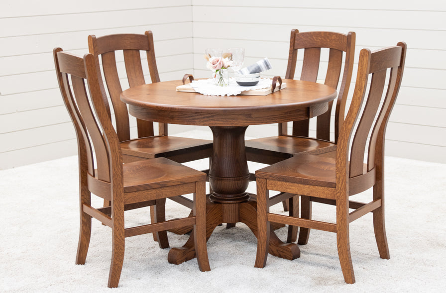 The Ellington Round Dining Table features folding leaves that store inside the table. Every dining table is available in your choice of wood type and stain color.