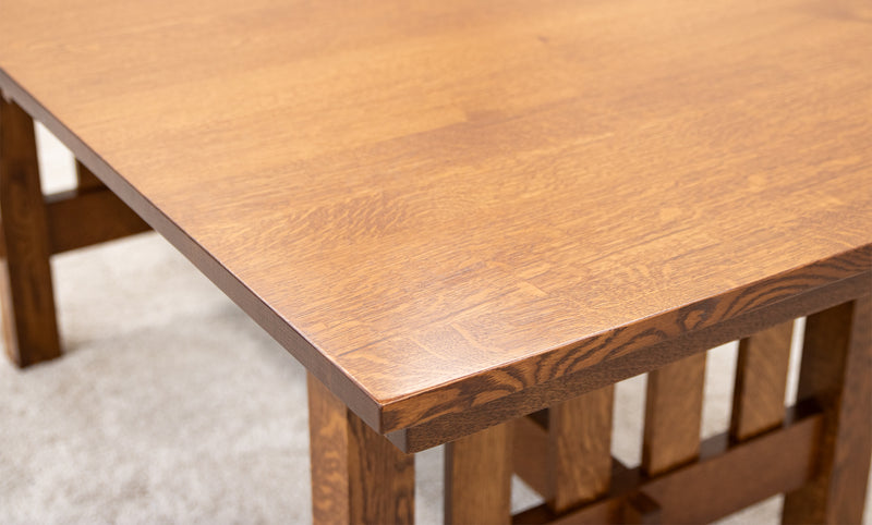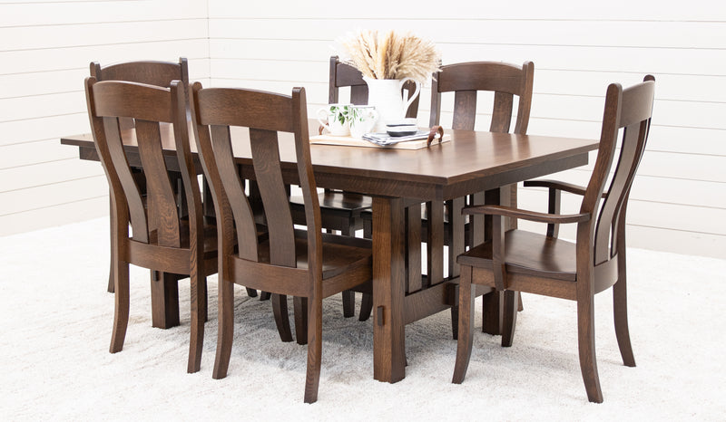 The Heavy Mission Trestle Dining Table is a solid, sturdy hardwood table, built to last. The Amish-made table is handcrafted in Ohio. The grain runs lengthwise on a table without leaves. The grain runs widthwise on a table with leaves. The table can be ordered in your choice of wood and color. For more details, contact a member of our team.