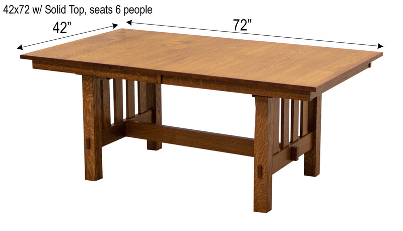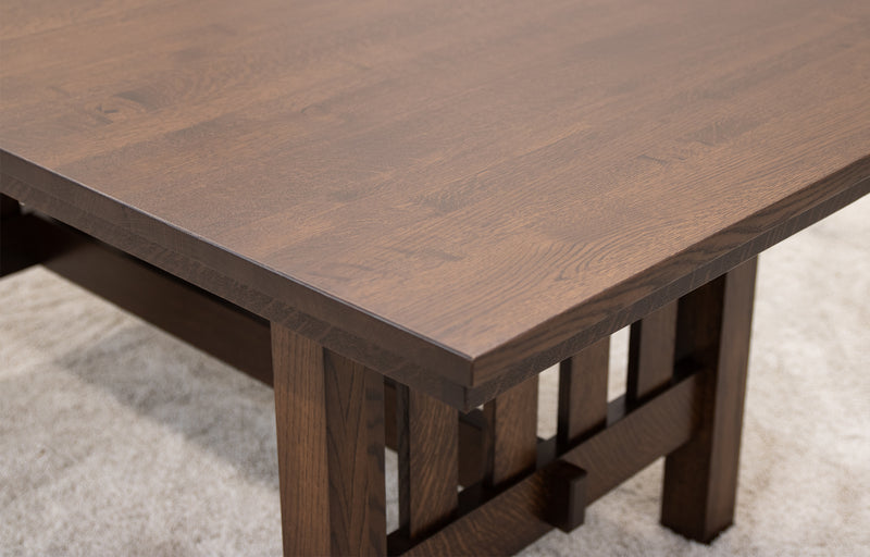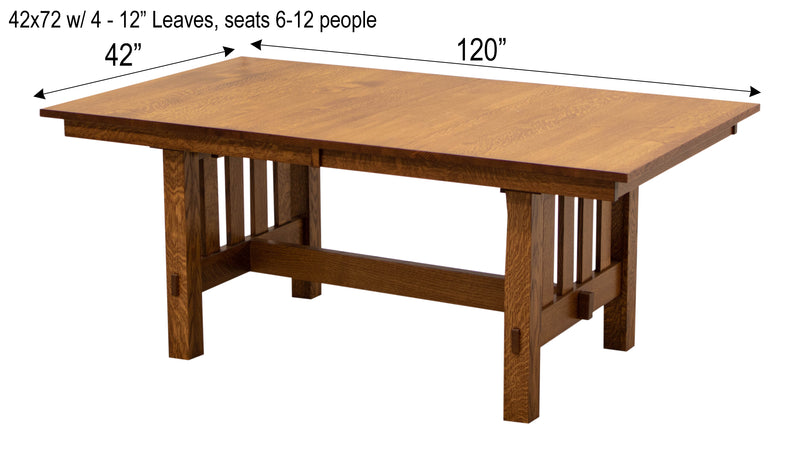 The Mission Trestle Dining Table features leaves that store inside the table. Every dining table is available in your choice of wood type and stain color.