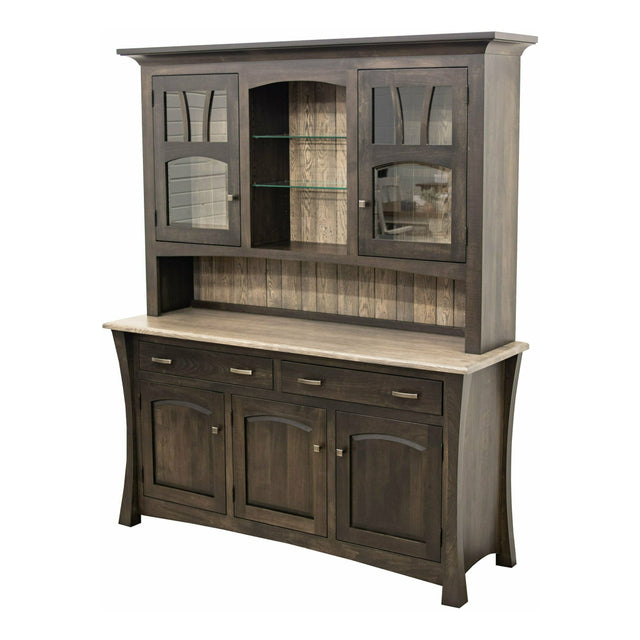 The Manhattan Hutch is a large, stylish and functional cabinet for any dining space. The China cabinet features flared legs and a shiplap back. The top includes can lights as well as wood framed, glass shelves with plate grooves. This Amish made hutch can be ordered in your choice of wood and color. Contact a member of our team for more details.
