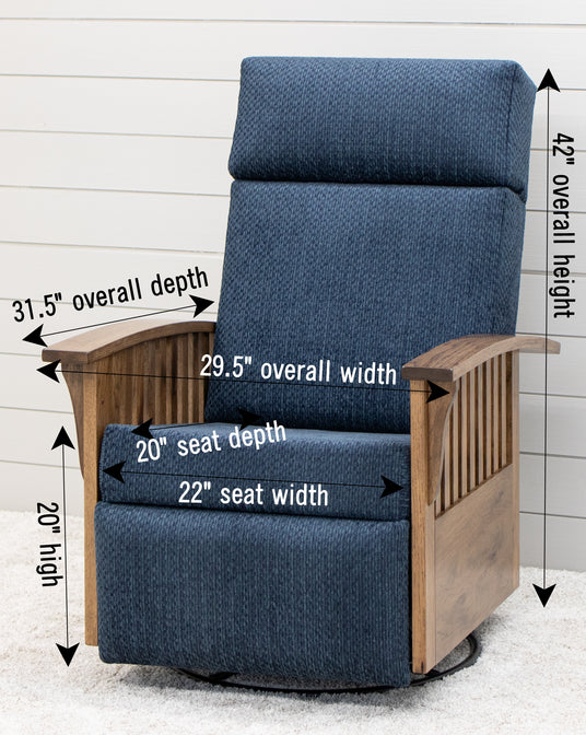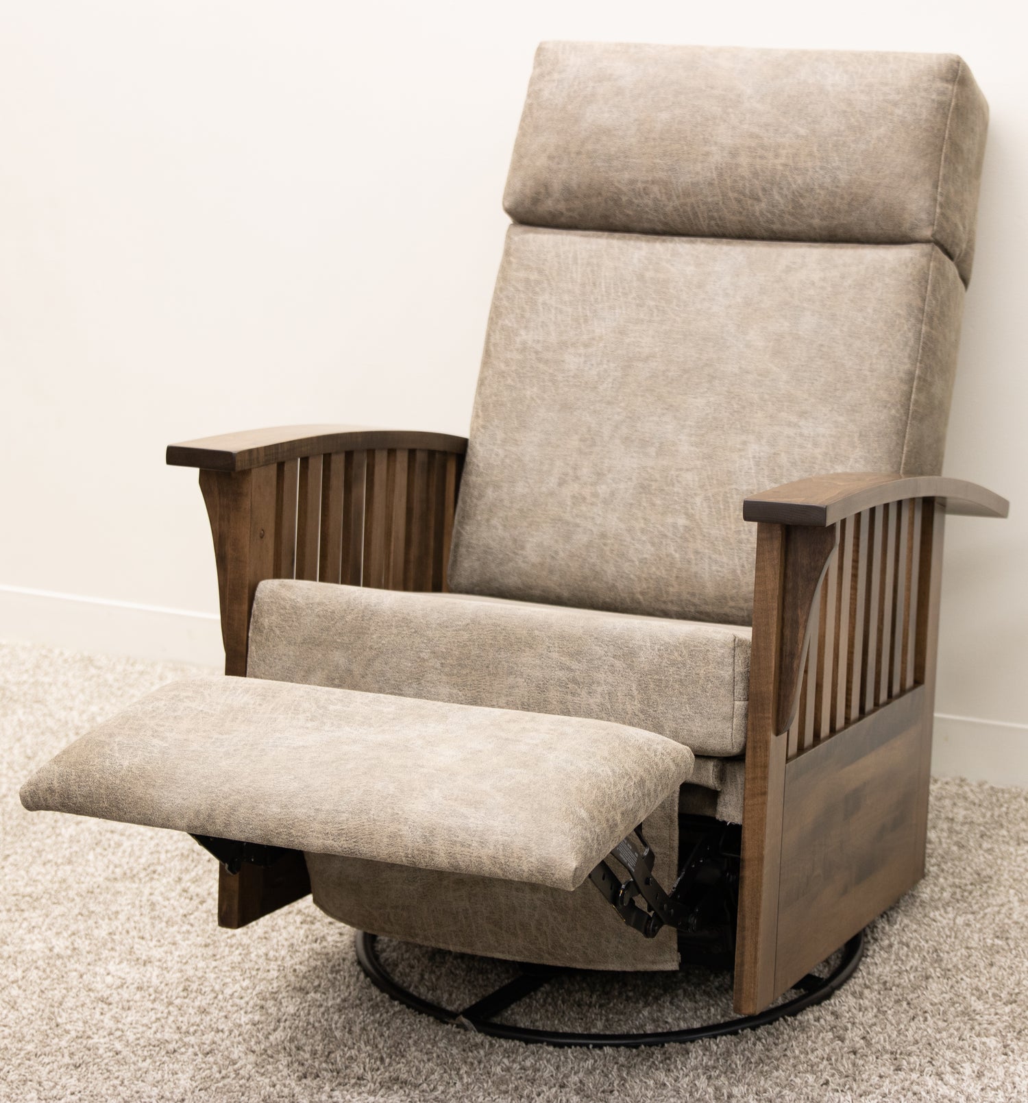 The Mission Swivel Glider is both a rocker and a recliner. The recliner features solid wood arms and a flip-out footrest. The swivel, gliding base allows complete rotation. Order this recliner in your choice of wood and fabric color. For more details, contact a member of our team at Upstate Amish Furniture Gallery.