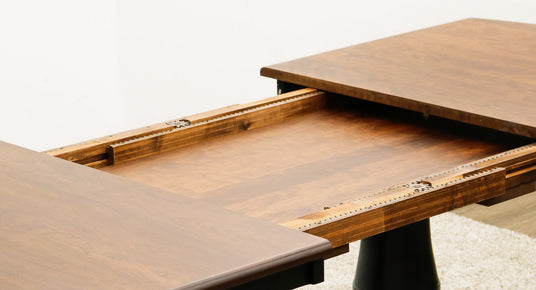 The Traditional Double Pedestal Dining Table features leaves that store inside the table. Every dining table is available in your choice of wood type and stain color.