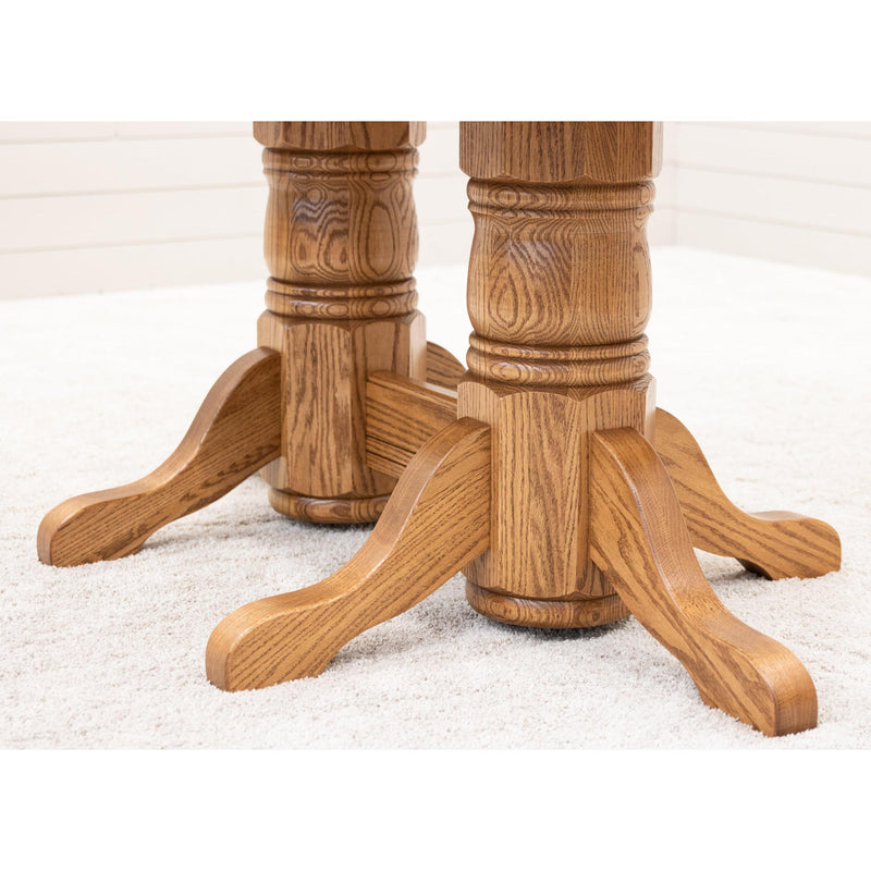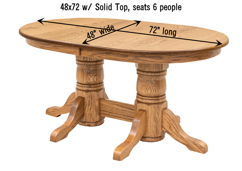 The Traditional Double Pedestal Dining Table is a sturdy, classic style built with solid wood. The table features self-storing leaves and an oval shaped top. The grain runs lengthwise on a table without leaves. The grain runs widthwise on a table with leaves. For more information, contact a member of our team.