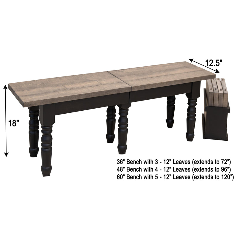 The Turned Leg Expandable Bench includes leaves to easily double it's length as needed. The leaves store in their own case as pictures. This stylish and versatile bench can be ordered in your choice of wood and color. Contact a member of our team for more details.